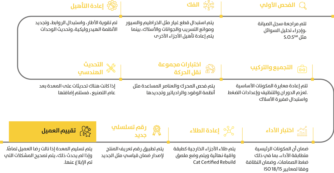 عملية إعادة بناء المعدات لدينا تتم خطوة بخطوة لتأخذ في الاعتبار حالة ومستوى أداء كل قطعة، من أصغر المكونات إلى أكبرها، والتي يُعاد بناؤها وفقًا لمعايير التجديد المعتمد من كاتربيلر.