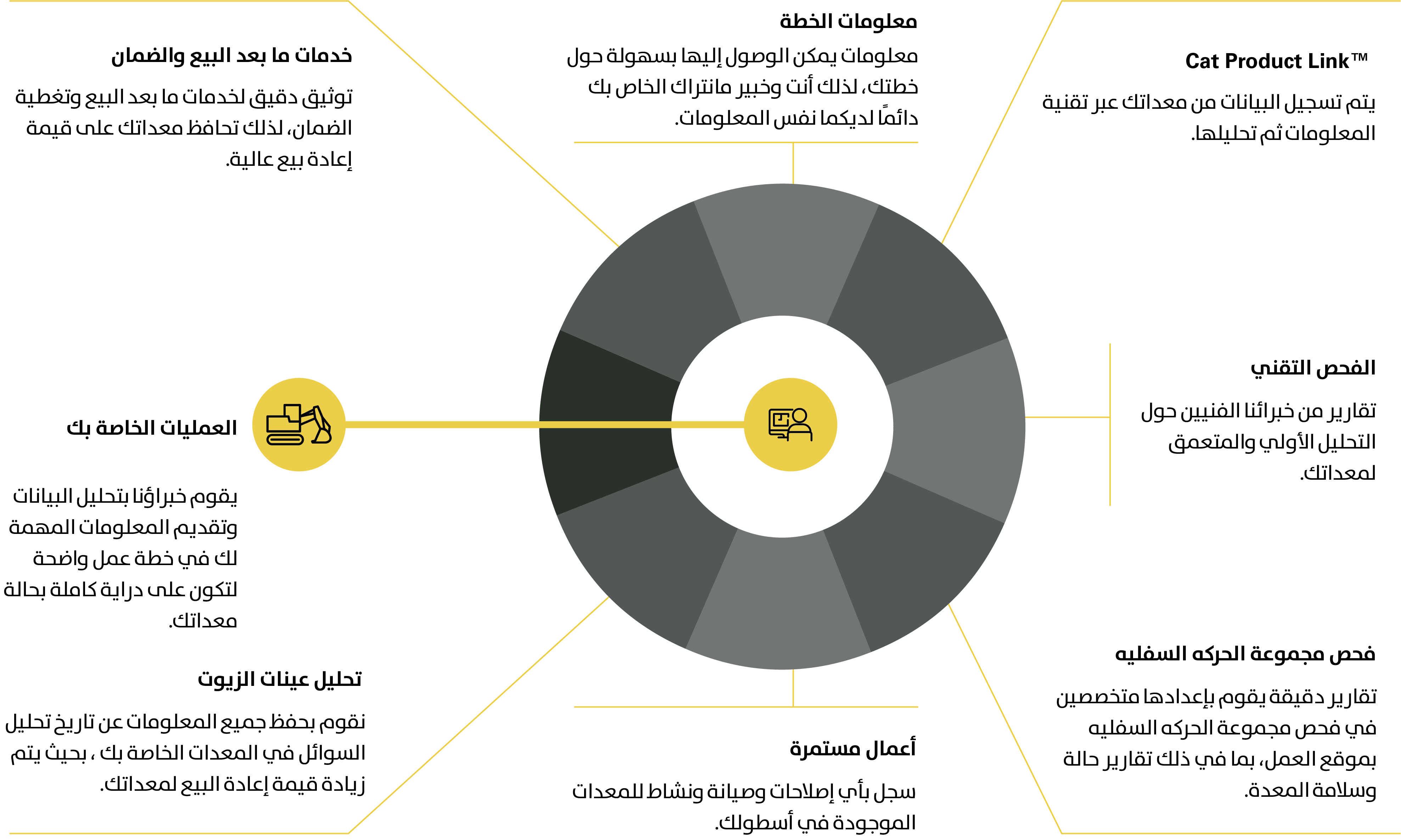 يتم إرسال بيانات الأداء إلى مركز مانتراك لمتابعة الحالة عبر تقنيات المعلومات. يتم بعد ذلك متابعة البيانات ومشاركتها من قبل المحللين المتخصصين المعتمدين من كاتربيلر.