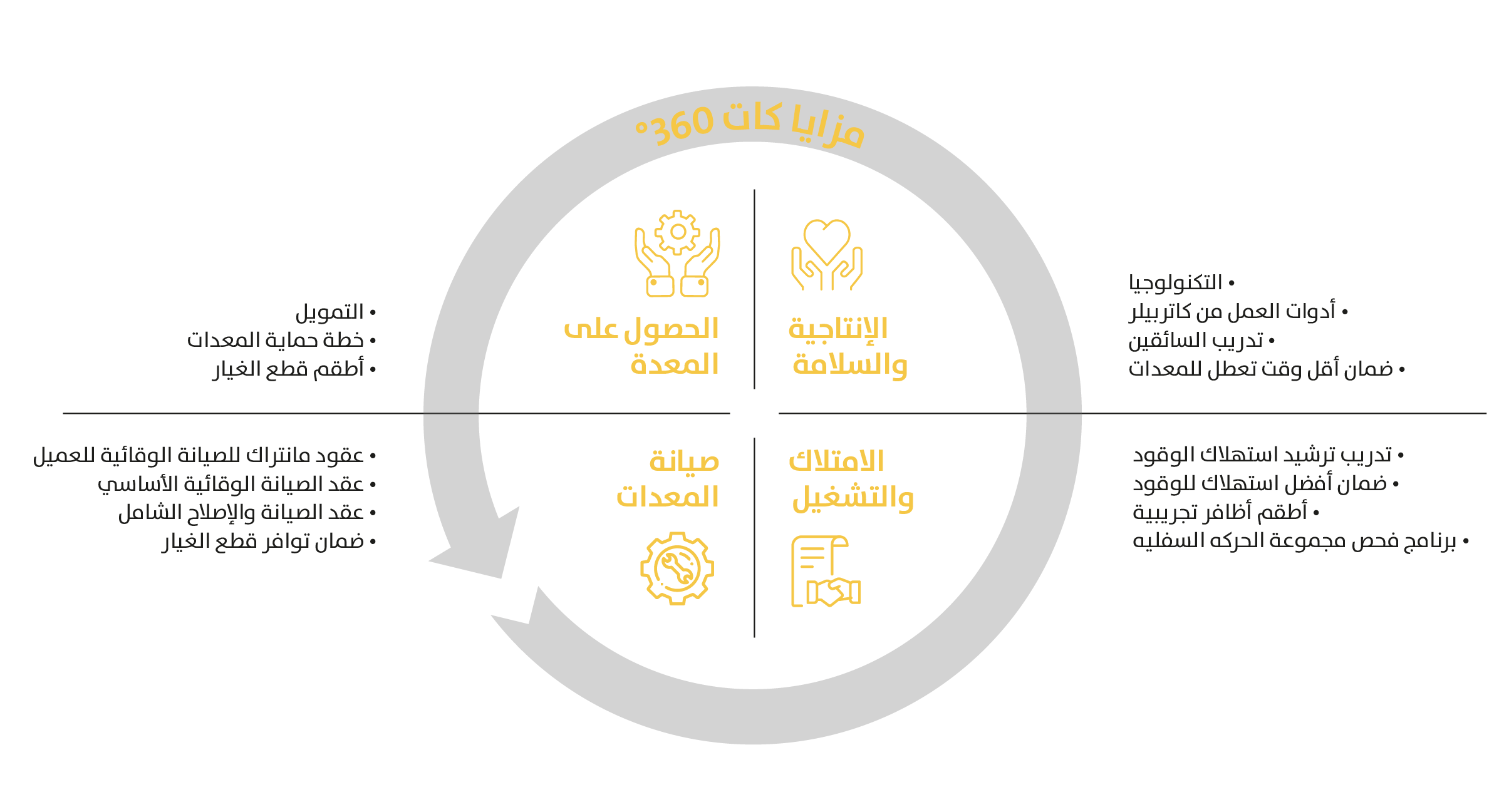 وبمجرد اختيار حلول كات 360°، نأخذ في الاعتبار كل مؤشر أداء ونعمل على تحسينه، مما يضمن لك أن مشروعاتك تسير على النحو الأمثل وأرباحك تزيد على المدى الطويل. وتعد حلول كات 360° مثالية لجميع الأعمال وذلك لأنها تتضمن العديد من الخيارات القابلة للتخصيص وفقا لاحتياجات كل معدة.